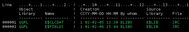 The following columns are output: Object library, Object name, Object type (*FILE,...), Object attribute (LF,PF,...), Object description, Century bit, Creation date (YY-MM-DD), Creation time (HH:MM), Created by user, Source library, Source file, Source member, Source change (YY-MM-DD).